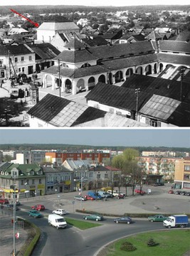 I was able to find some comparison photos of the town square from Tomaszow Lubelski on the Internet, at the link here. The top photo shows what I think is the synagogue (red arrow) in 1938, and it appears to be a very large building in the town center. The bottom photo is circa 2003. The synagogue is gone. As detailed in a later post, on September 6, 1939, Germans bombarded the town, and the main synagogue and other prayer-houses went up in flames. So, it is likely that this happened around a year after the first photo above was taken.